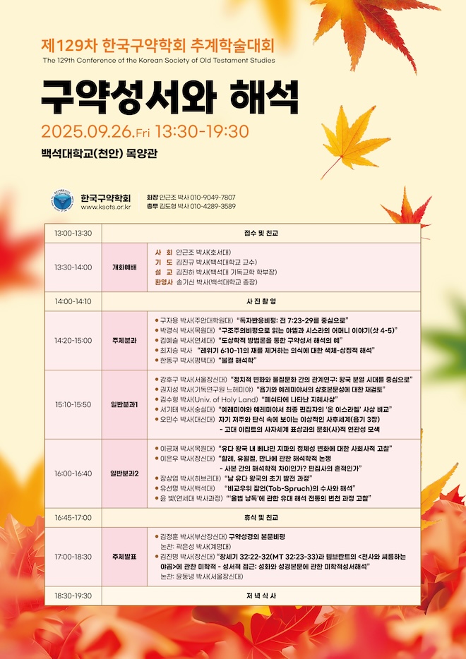제129차 한국구약학회 추계학술대회 페이지 정보 작성자 구약학회 (221.♡.113.236) 댓글 댓글 0건 조회Hit 128회 작성일Date 25-12-09 15:27 본문 . 추천0 비추천0 목록 이전글제130차 한국구약학회 송년 학술대회 25.12.09 다음글제128차 한국구약학회 춘계학술대회 25.12.09 댓글 0 댓글목록 등록된 댓글이 없습니다.